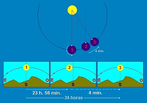 Recordemos la definición de día sidéreo: es el período de rotación medio con referencia a las estrellas (23h 56m 4.091s de tiempo solar medio). En definitiva se corresponde con el período de rotación de la Tierra. Además sabemos del movimiento de traslación.