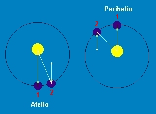 Afelio y Perihelio son dos puntos de la posición de la Tierra en su órbita que, como ya hemos repetido multitud de veces, corresponden respectivamente a los puntos de máxima y mínima distancia de ésta con respecto al Sol. El Afelio ocurre entre el 2 y el 3 de julio y el Perihelio entre el 2 y el 3 de enero.