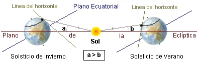 En la imagen se comprueba también cómo el plano Ecuatorial se encuentra por encima de la Eclíptica en el primer caso y por debajo en el segundo. Pues bien, la línea que parte del observador hacia el Sol es la dirección de su mirada y vemos cómo el ángulo que se forma es distinto en cada caso: en la posición correspondiente al solsticio de Invierno ve el Sol a muy poca altura sobre el horizonte, por debajo de la línea del plano Ecuatorial y muy alto en el solsticio de Verano, por encima de la línea del plano Ecuatorial.