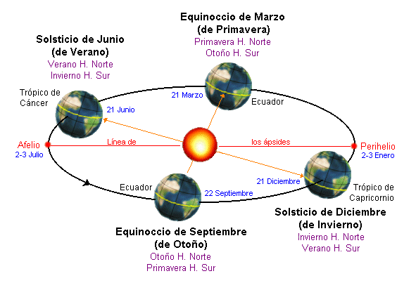 Párrafos arriba estábamos recurriendo a los términos de afelio y perihelio para explicar el por qué de las estaciones. En la figura volvemos a ver, aparte de otras dos intermedias, esas dos posiciones de mayor y menor distanciamiento de la Tierra con respecto al Sol, pero ahora tienen otros nombres: solsticio de junio y solsticio de diciembre. Pues bien, se hace imperativo aclarar que Afelio, Perihelio y solsticios no son sinónimos y que no hacen referencia a la misma cosa. A ver cómo aclaramos esto...