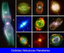 Su espectacular colorido se debe al mismo fenónemo que ocurre en las nebulosas de emisión. En este caso los átomos del gas desprendido, mayoritariamente hidrógeno, se ionizan por efecto de la radiación ultravioleta de la estrella central. En el proceso de salto de los electrones de uno a otro nivel de energía del átomo de hidrógeno se libera energía en forma de fotones de luz, fenómeno que en Astronomía se conoce como fluorescencia. Dos ejemplos cartacterísticos de este tipo de nebulosas, visibles con un telescopio mediano, es la Nebulosa del Anillo (M57) en la constelación de Lyra y la Nebulosa Dumbbell (M27) en la constelación de Vulpecula. |