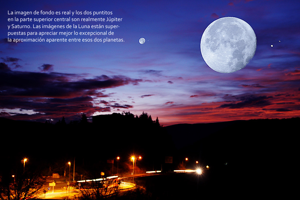 Observaciones : Aunque no lo parezca lo cierto es que apenas tuve unos 20 minutos para conseguir alguna captura pues el cielo se cubría de nubes muy rápidamente. La foto de fondo es real y el par de puntitos blancos brillantes que se observan en el centro superior son realmente Júpiter y Saturno. Pero las dos imágenes de la Luna están superpuestas a la toma para mostrar lo excepcional de esta conjunción. Realmente los dos planetas estaban muy próximos: a tan solo 6 minutos de arco (la quinta parte del diámetro de la Luna) como no lo habían estado en los últimos 400 años. No ha sido la séptima maravilla y, si no se sabe de las distancias aparentes de las que hablamos, ni siguiera ha sido nada para la mayoría. Pero después de 400 años a mí me ha gustado haber estado aquí para observarlo y entenderlo.