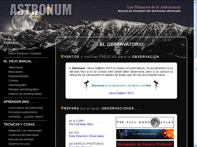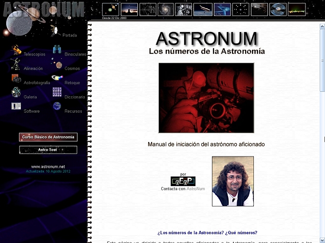 Durante un tiempo Astronum se convirtió en un referente bastante completido de página en español dedicada a la Astronomía. Sin embargo, hoy parece estar superada por otras orientaciones de caracter más práctico y/o dinámico -léase blogs, foros y redes sociales dedicadas- que el puramente teórico y observacional. Pero, pese a que he prestado interés en actualizar algunos de sus contenidos, me he llevado la sorpresa de que no puedo pues, salvo aquellos que se han visto afectados por las mejoras tecnológicas, el resto sigue reflejando fielmente las inquietudes del recién llegado. Aunque (lamentablemente) precisamente el recién llegado pretende hoy cubrir todo su conocimiento repentinamente recurriendo a las aplicaciones astronomómicas descargadas en su móvil y que le alejan del excitante descubrimiento progresivo ¿Para qué aprenderse las constelaciones si apuntando al cielo el aparato ese ya te las marca con sus líneas y con su todo? Personalmente creo que hay demasiadas cosas (no sólo Astronomía) que estamos empaquetando convulsiva y alocadamente en una pantalla de 4 pulgadas.
