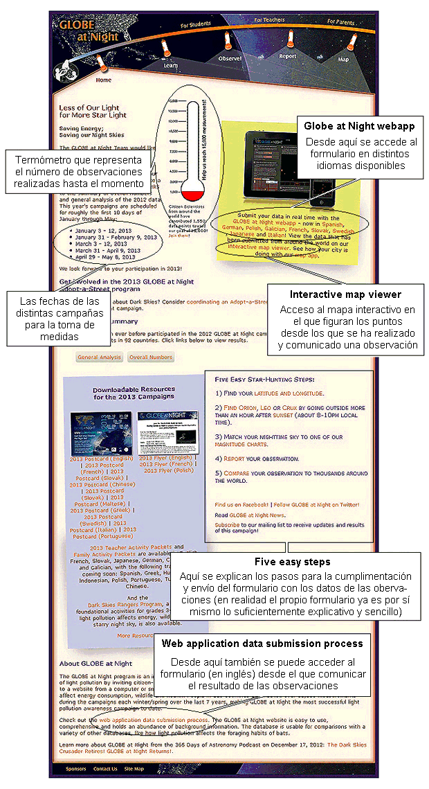 Lo siento: la página GLOBE at Night ha sido totalmente rediseñada y la imagen que os ofrezco más abajo para guiaros por sus contenidos ya no tiene mucho sentido. Aún así voy a dejar esta sección tal cual por el trabajo que me dio en su día ;-) Lo cierto es que el diseño actual es mucho mejor y el objetivo el mismo.