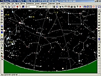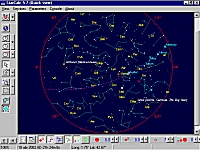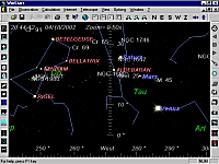 Este es otro planetario realista, quizás más que WinStars. Pero no hagáis caso de la imagen adjunta porque no da ninguna cuenta de los excelentes gráficos de este programa. Los amaneceres y atardeceres son expléndidos. Las estrellas tintilean. Podremos movernos con total libertad por toda la bóveda celeste simplemente haciendo uso de las teclas de movimiento del cursor. También podremos seleccionar un cuerpo celeste (planeta u objeto Messier) y hacer zoom hasta obtener una imagen fotorealista del mismo. Las opciones que ofrece el programa son pocas y simples, pero orientadas todas ellas a disfrutar del cielo nocturno como si lo estubiéramos viendo realmente.