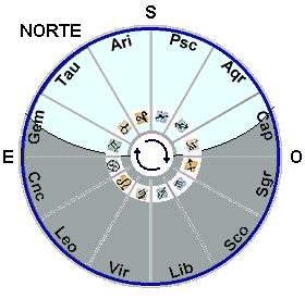 La figura muestra cómo están dispuestas estas constelaciones y su valor no es más que el de servir de referencia para su memorización empleando el recurso que a cada cual se le ocurra. Las flechas del círculo interior indican el sentido de giro de la plantilla para ver cómo se suceden en el firmamento norte. Pasando el cursor por la imagen veremos cómo se disponen para un observador en el hemisferio sur. La interpretación de la figura sería la siguiente:
