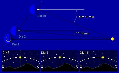 Fijándonos en la figura vemos como el día 1 el observador terrestre tiene sobre el meridiano del lugar y a una determinada altura la visión de una bonita estrella. Al día siguiente, día 2, a la misma hora se dispone nuevamente a observarla, dándole la impresión de que sigue en el mismo sitio. Confiado deja pasar un tiempo y dirige nuevamente su mirada hacia ella el día 15. Ahora sí se da cuenta de que la estrella no está en el mismo lugar: se ha desplazado hacia el Oeste.
