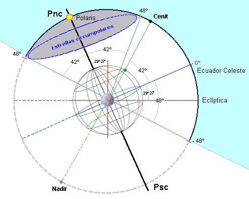 En el ejemplo el observador se encuentra a 42° de latitud, entonces 90-42=48 grados de declinación sur. Es decir, vemos hasta 48° más allá del Ecuador celeste. Que es lo mismo que decir 48° de declinación sur.