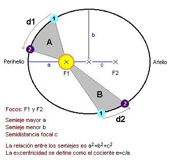 La imagen muestra algunas de las características determinantes de una elipse. Observamos que su excentricidad viene dada por la distancia que separa los dos focos (F1 y F2). Si esa distancia se reduce a 0 la elipse se convierte en un círculo perfecto y los semiejes a y b se fusionan en lo que sería su radio. En las órbitas de los planetas, a excepción de Plutón, ambos focos están muy próximos por lo que sus órbitas son muy poco excéntricas, casi circulares (en la imagen se ha exagerado por cuestiones didácticas). En el caso de la Tierra la razón de excentricidad es de 0.0167.