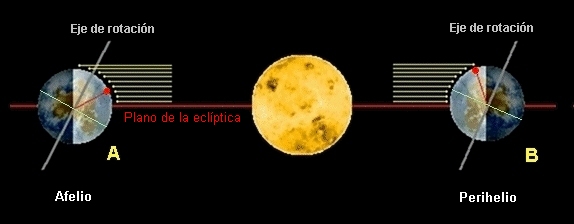 Tomando como referencia ese punto observamos cómo, en la posición de afelio, los rayos del Sol inciden más perpendicularmente sobre el hemisferio norte de lo que lo hacen en la posición de perihelio. En A es verano en el hemisferio norte e invierno en el sur y en B es invierno en el hemisferio norte y verano en el sur.