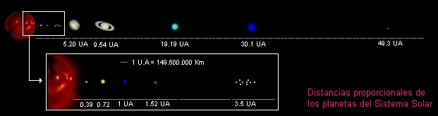 Antes de acabar fijaros nuevamente en la imagen que representa las distancias proporcionales de los planetas del Sistema Solar. Para poder poner a la estrella más cercana a nosotros deberíais alargar por la derecha la pantalla de vuestro PC hasta algo más de 1.000 metros. En aquel extremo aparecería Proxima Centauri, a 266.000 UA (4.2 años luz).