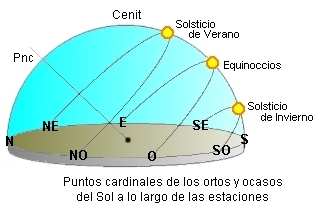 Los acontecimientos transcurren como sigue: el 21 de marzo, fecha del equinoccio de Primavera, el Sol sale por el Este y se pone por el Oeste. Al pasar los días estos puntos van desplazándose hacia el Norte hasta el 21 de junio, fecha del solsticio de Verano, en que el Sol alcanza su máxima altura.
