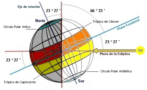 Recordemos que la Tierra realiza su movimiento de traslación alrededor del Sol en un plano llamado plano de la Eclíptica que corta al Sol y a la Tierra en dos mitades como si se trataran de dos medias naranjas. Y recordemos también que el eje de rotación no es perpendicular a ese plano, sino que tiene una inclinación con respecto a éste de 23° 27'. Pues bien, las estaciones tienen lugar debido a la inclinación del eje de rotación.
