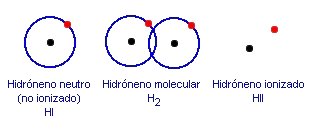 Como el hidrógeno es el gas predominante y porque hablaremos de él seguidamente al tratar los distintos tipos de nebulosas veamos en una imagen cuales son los tres estados en los que puede presentarse. El hidrógeno neutro (HI) es hidrógeno en su estado puro, un núcleo y un electrón. En el hidrógeno ionizado (HII) el núcleo ha perdido su electrón debido a una fuente de energía externa al propio átomo, el desprendimiento produce un fotón de luz. En el molecular (H2) los átomos de hidrógeno se han unido formando moléculas.