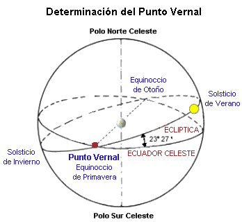 El punto rojo marcado en la figura correspondiente al equinoccio de primavera se le llama punto Vernal, nodo ascendente ó punto Aries y es el que da origen al sistema de coordenadas celestes como veremos en el siguiente punto. Lo de llamarse punto Aries tiene una explicación: cuando se determinó ese punto hace unos 2000 años el Sol se proyectaba al comienzo de la primavera en la constelación de Aries, pero debido al movimiento terrestre de precesión, por el cual el eje de rotación se desplaza 50,25 segundos de arco anualmente, actualmente, 2000 años después, ha girado un ángulo de 27,92° proyectándose en la constelación de Piscis (50,25 x 2000 = 27,92°).