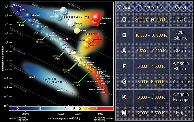 La combinación de la temperatura, color y brillo da lugar a la clasificación que aparece en la tabla de la derecha de la imagen y que se nombra con las letras O,B,A,F,G,K,M. Cada una de estas letras se corresponde con un margen de temperaturas superficiales de las estrellas y con el color que muestran. Temperatura y color producen el brillo con que se las observa.