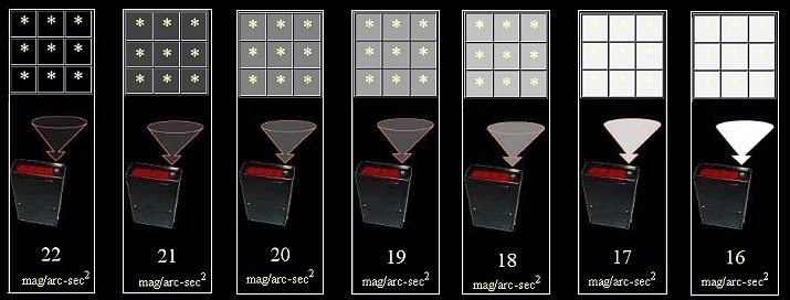 La imagen siguiente (tomada de www.nightwise.org/magnitudes.htm) muestra intuitivamente el significado de la escala MPSAS obtenida con el instrumento SQM. Cada uno de los valores que aparecen son los que corresponderían a un cielo cuyo brillo de fondo fuera precisamente el de una estrella con una magnitud aparente de ese valor. Repasad la definición porque es esclarecedora.