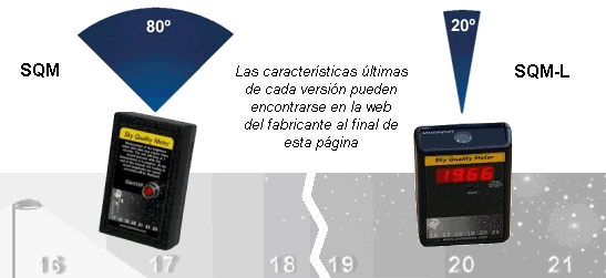 En la siguiente imagen se muestran dos de los muchos modelos de Sky Quality Meter existentes (algunos con puerto USB y todo): el SQM y el SQM-L, que se distinguen principalmente por la región angular de cielo que abarcan aparte de por el diseño. En todo caso el SQM-L es más direccional, lo que permite tomar medidas de distintos sectores de cielo desde un mismo lugar de observación.
